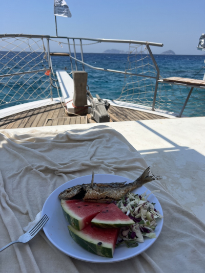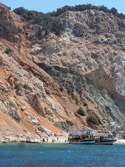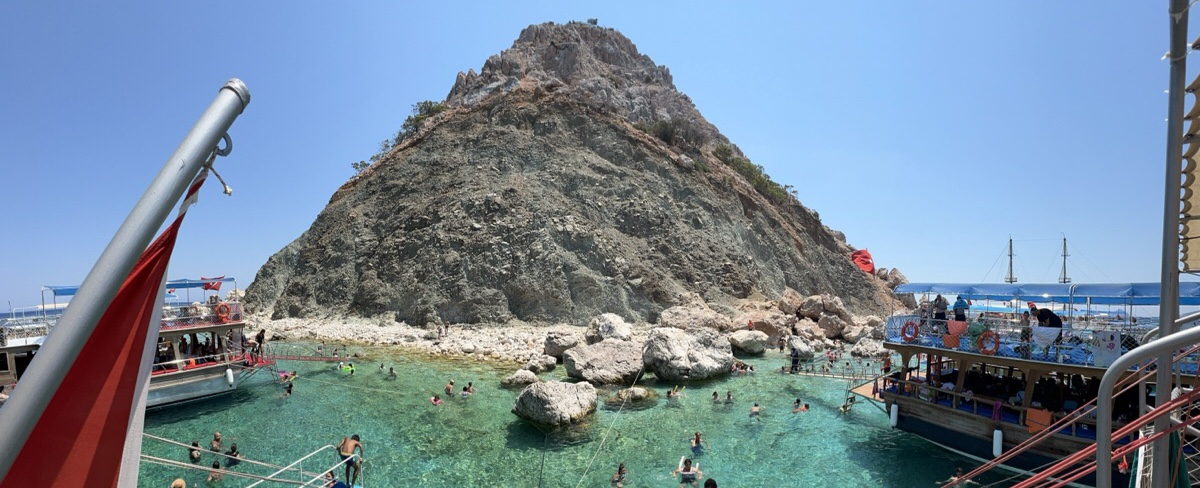 Aun así intentan llegar de forma escalonada y eso ayuda porque no ves la masificación real que hay de turistas. Aun así, para mi vale mucho la pena, esas aguas turquesas son las mejores de Turquía y el paisaje árido parece sacado de otro planeta. Suluada es como una roca enorme de color anaranjado que tiene diferentes playas de roca y arena blanca, y ese blanco es el que le da ese color maravilloso al agua. Hay momentos en que realmente puedes disfrutar de la playa porque hay poquitos barcos, justo cuando hay el cambio es cuando te das cuenta de la masificación. En el tour que cogimos tenías la comida incluida tipica de abordo, pescado con pasta, ensalada y sandia, y paradas en 3 playas diferentes más el famoso arco e Suluada. En todas las playas tenías espacio para bañarte y relajarte en esas maravillosas aguas, algunas más profundas que otras.