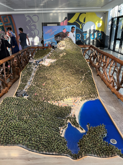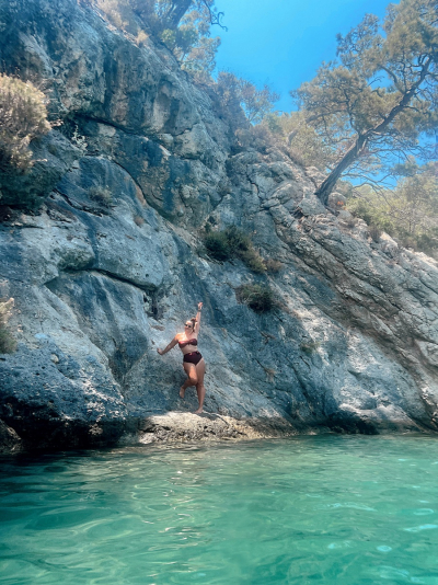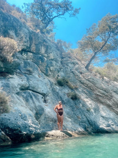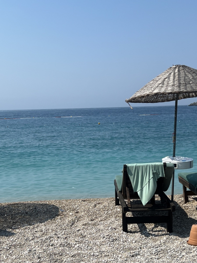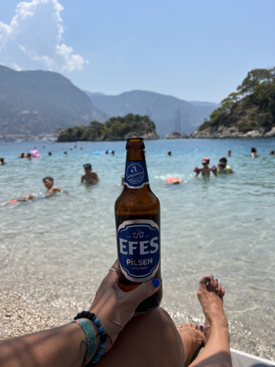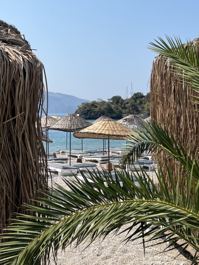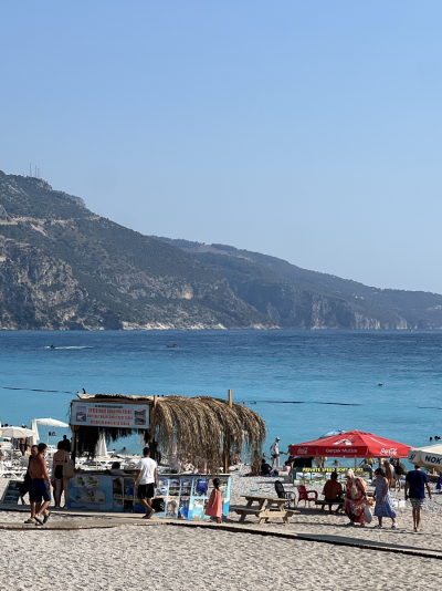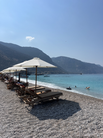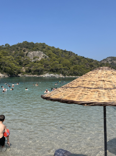 La zona por la que es famosa esa parte de la Riviera turca, es la lengua de arena que se puede apreciar desde el aire, porque desde la playa actualmente la han explotado tanto y hay tantos Beach Clubs, lleno de sombrillas y hamacas que ya no te das cuenta de su forma. Es una pena que esté tan explotada, pero aun así continúa siendo preciosa, tiene un color verde esmeralda espectacular y divide el mar en la zona de la laguna. Puedes nadar tranquilamente porque es como un lago, el agua está tranquila no hay corriente y puedes nadar de lado a lado porque en el horizonte hay rocas o playa.
